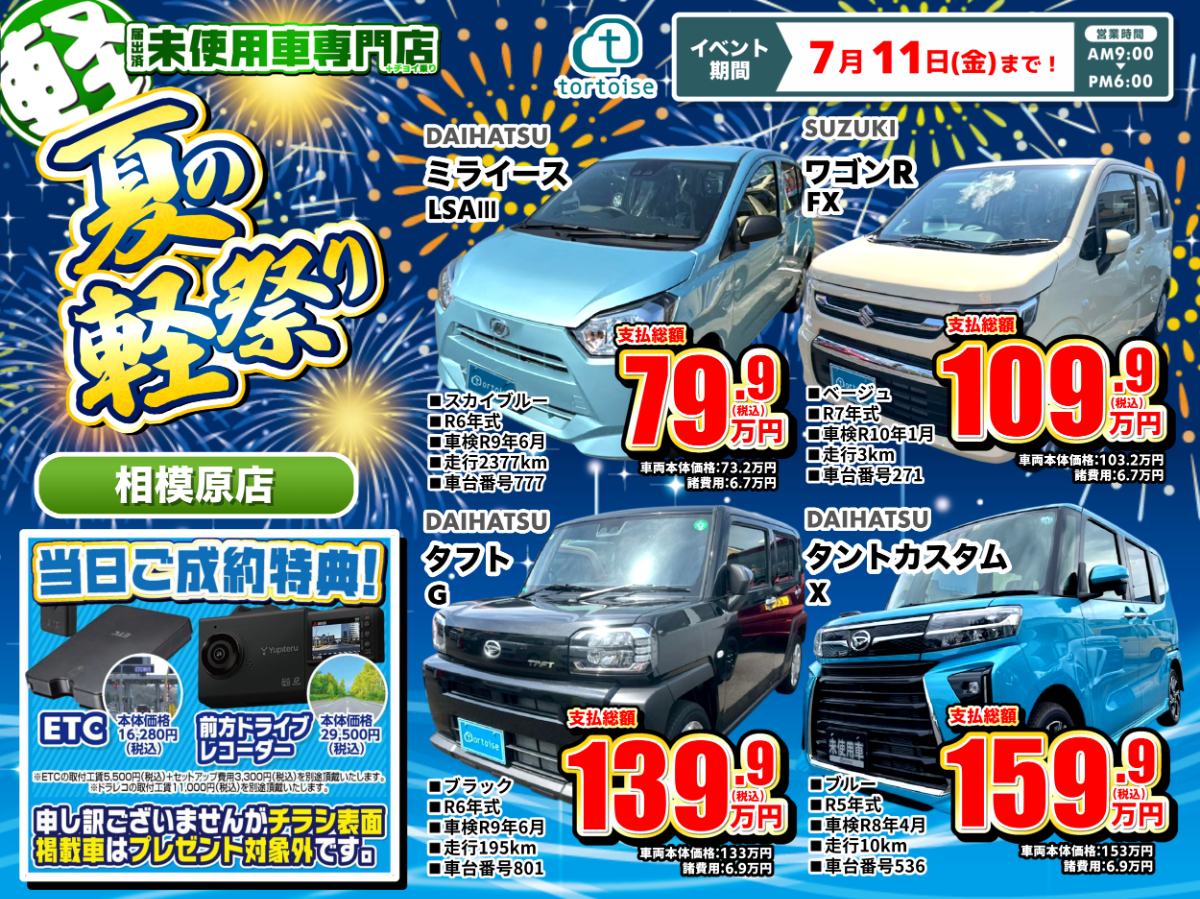 広い展示場に豊富にラインナップされています。広い展示場には、新型モデルから登録済み未使用車まで、トータス一押しの軽自動車がズラリと並んでいます。知識豊富なスタッフが、おひとりおひとりのお車選びを親身にサポート。あなたにぴったりの一台がきっと見つかるはずです。